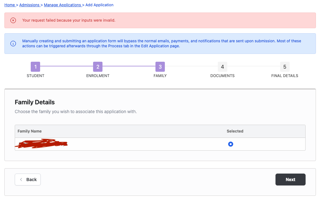 We are seeing this error with a family who is trying to add a third child via the admissions process. The first two kids went through the admissions process without any issues, but we are seeing this error with the third child on this page. Am I missing something obvious?