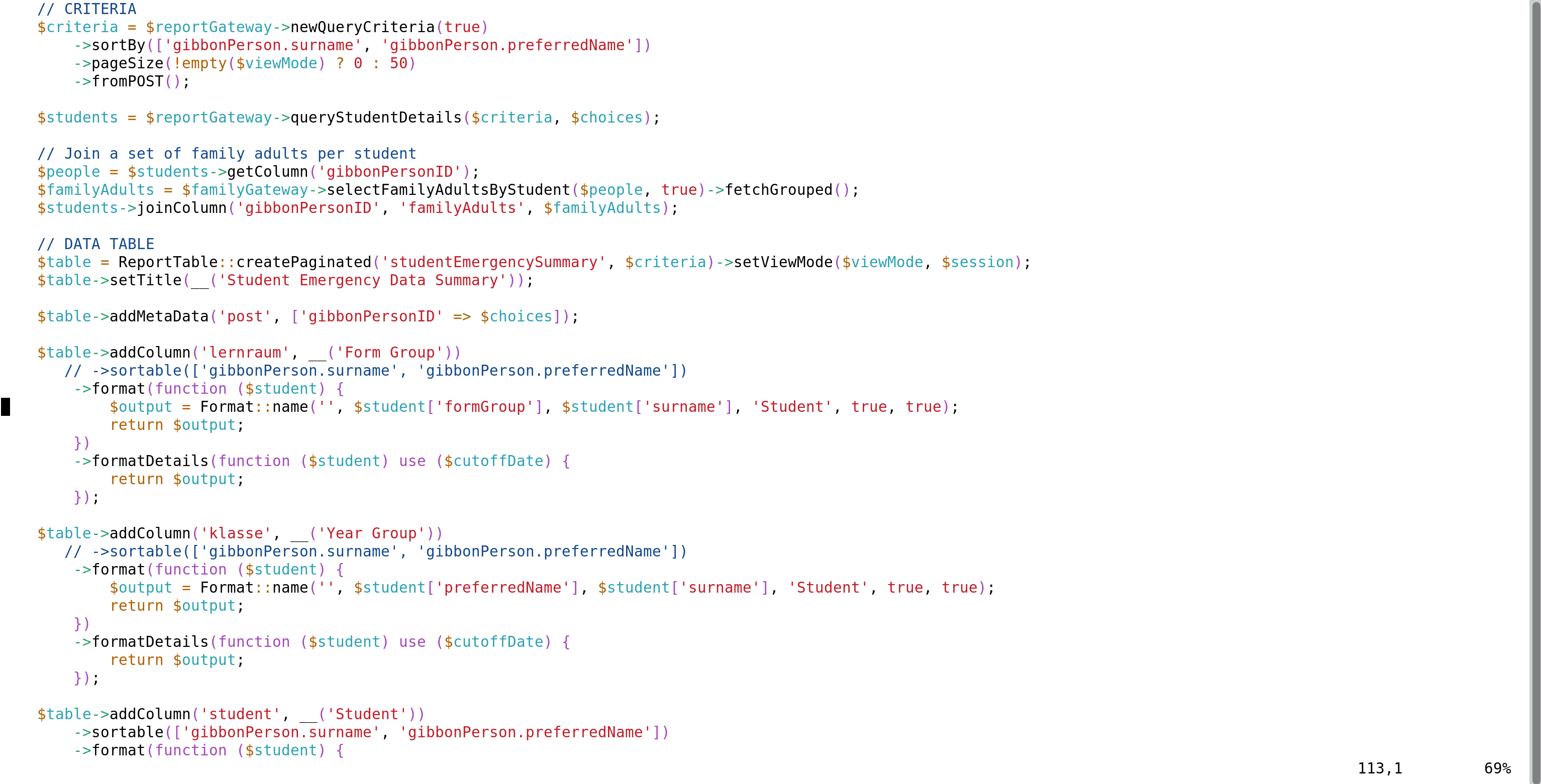 I am currently attempting to customize the Emergency Data summary found under People → Students. I want to add the Year Group and Form Group of each student to the table. To do this i am directly editing the php file report_student_emergencySummary.php found in /modules/Students.