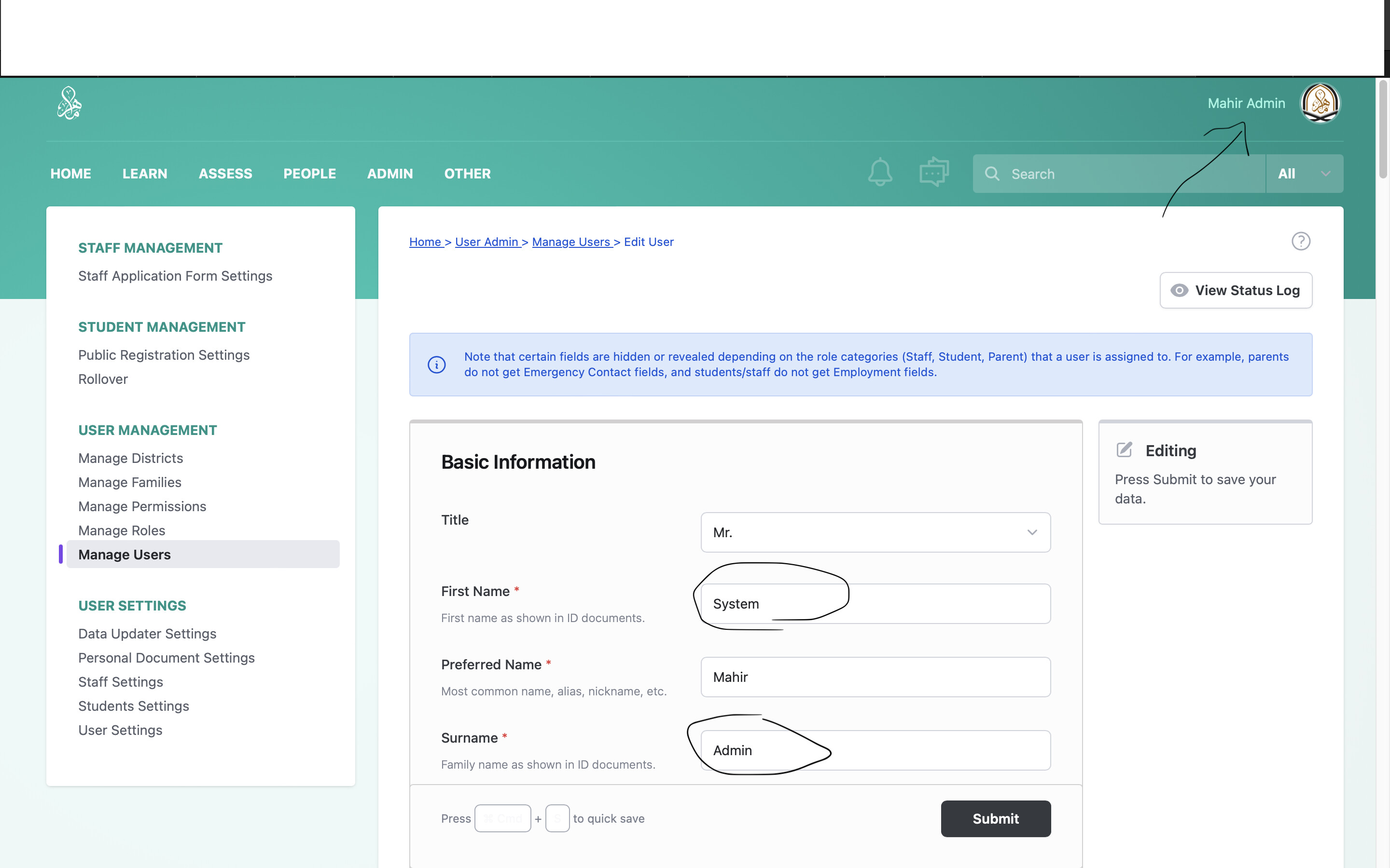 Thank you for your question. I think the best solution in your case would be to assign the preferred name same as the first name since throughout the system, that is the pattern you will come across for displaying student names. Otherwise, it would require to manually change the code in a few places to reflect the name according to your requirements. For example, if a user’s name is John Michael Smith: