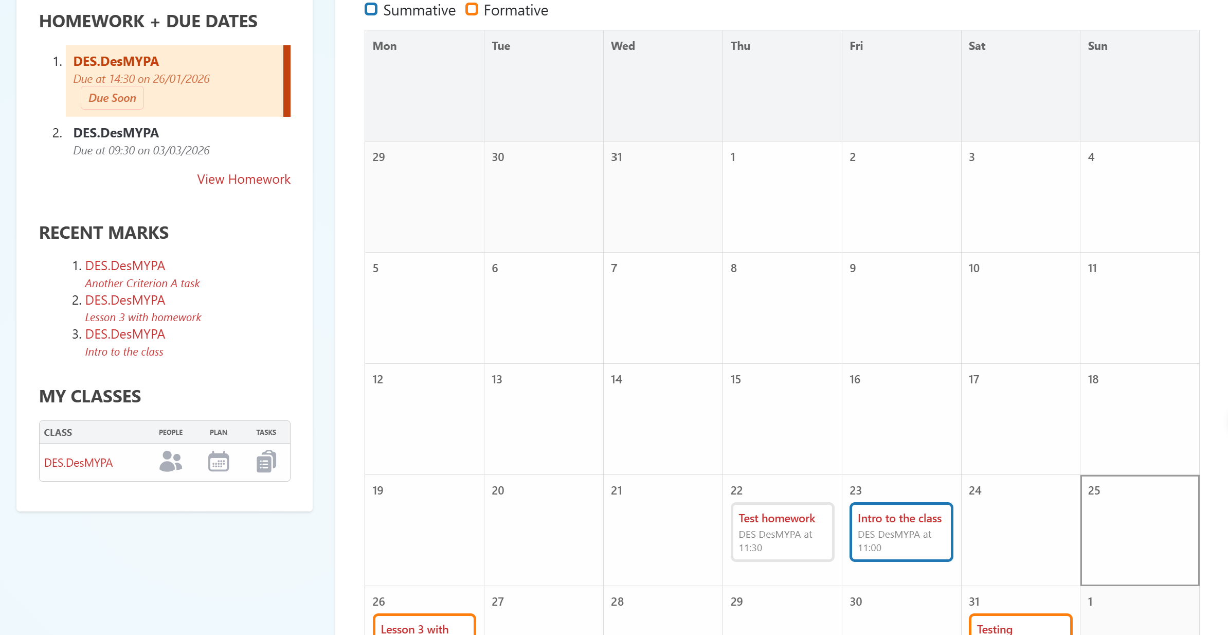 Importantly, homework items are colour-coded by assessment type, with a legend shown at the top. In my implementation, our school would use just “Formative” and “Summative” as assessment type, but the module adapts automatically based on the different types in the Markbook settings.