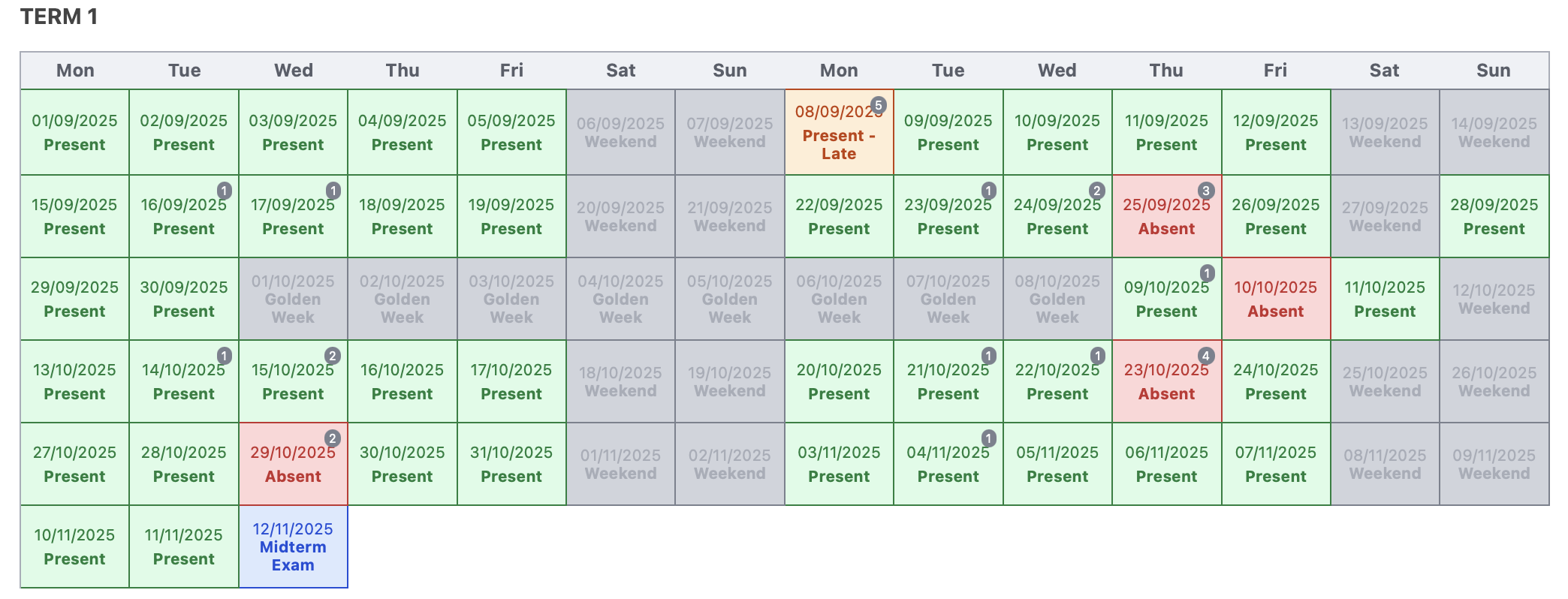 When viewing the term-based attendance calendar, the weekly layout does not align consistently across browsers. Cells that should appear in a continuous grid layout instead display staggered or broken alignment in multiple browsers.
