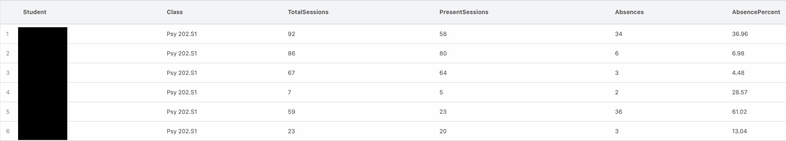 So far, I have only been able to generate attendance reports by day. This means that if a student attends just one lesson in a given day, they are marked as having 100% attendance for that day, even if they were absent from other lessons scheduled on the same day.