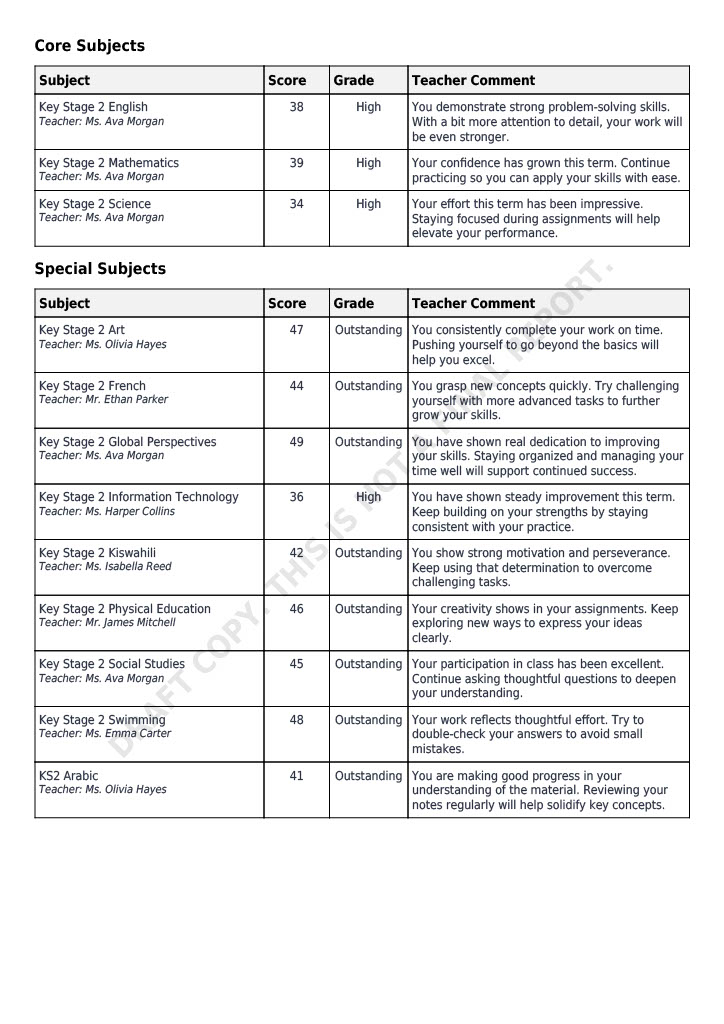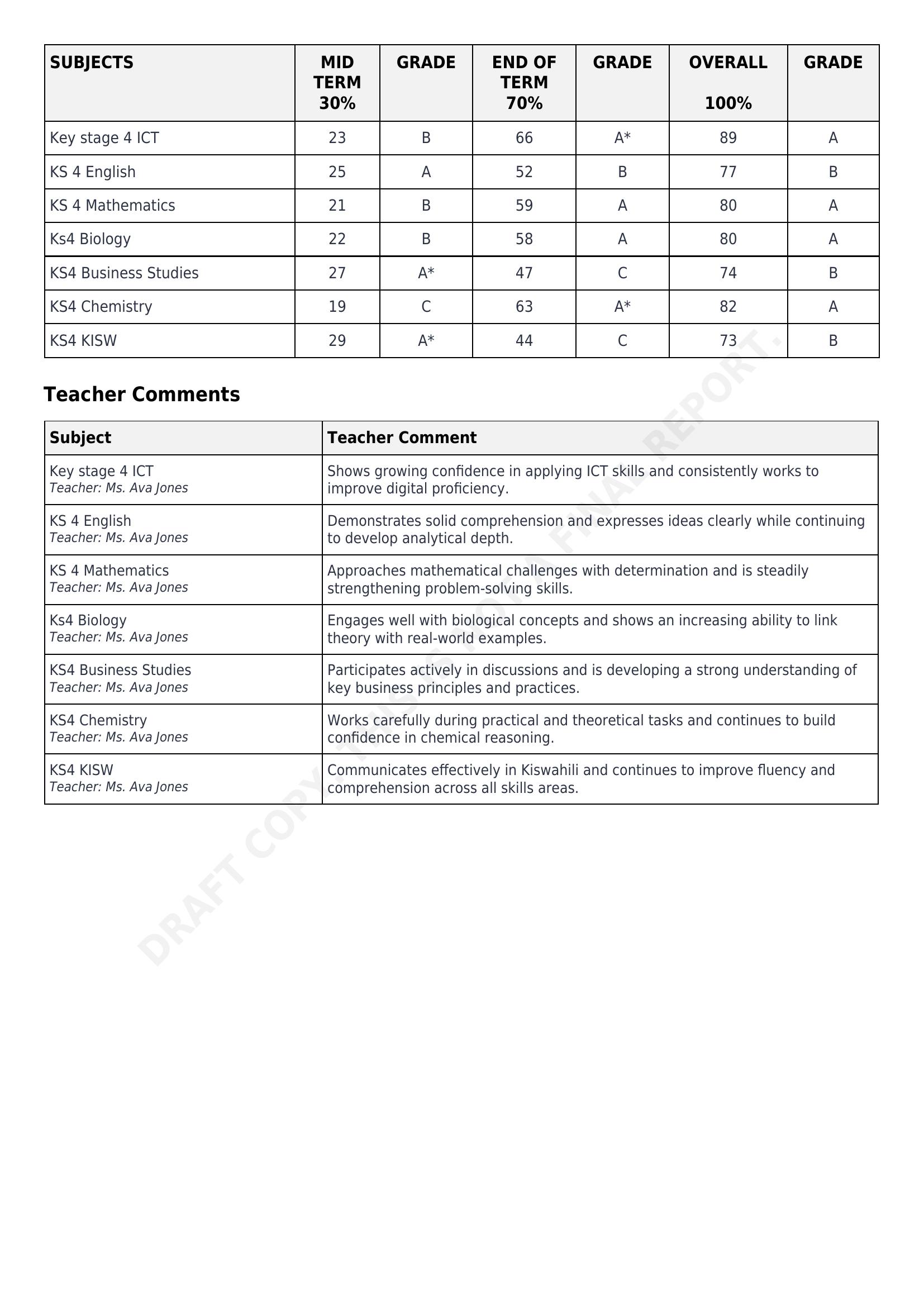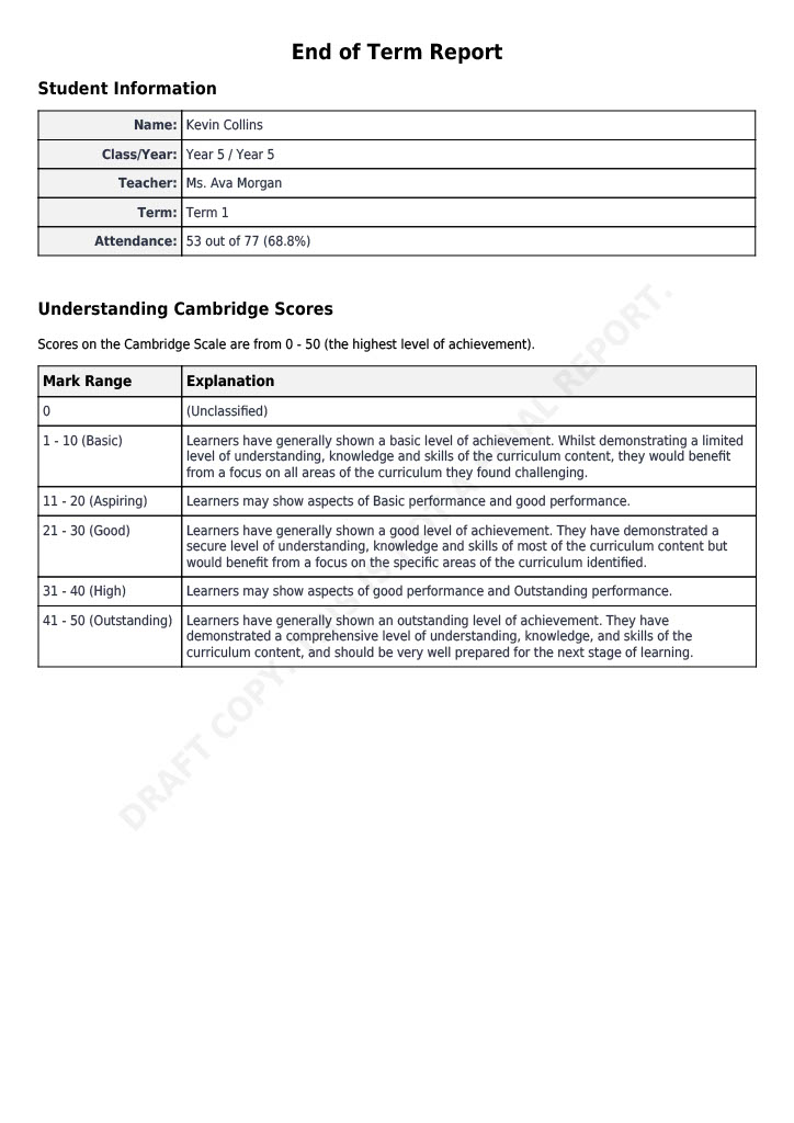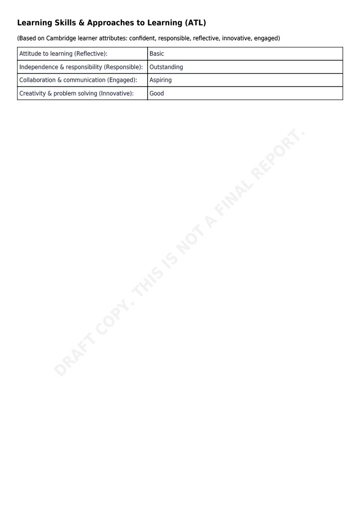 Below are the last couple of pages from the IGCSE report as an example.